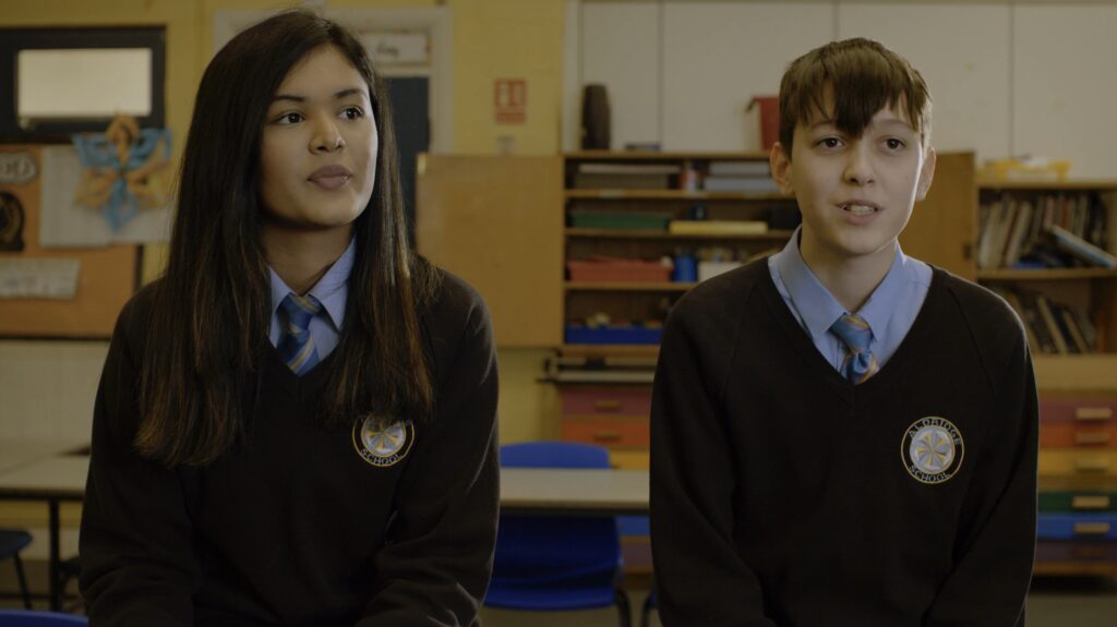 The film We Need To Talk About Masculinity is our newest addition to EasySRE.net and it’s presented like a true-crime documentary in which a series of characters talk about an incident in school between our lead characters, Max and Sophie. Max is persuaded to ask Sophie out on a date but when she rejects him, Sophie’s friends starts spreading rumours about Max. Spurred on by bad advice from Niall and skewed social media content, Max starts to bombard Sophie with texts until her confronts her, angrily at some lockers. Luckily a teacher, Mr Timms, intervenes. Max comes to see the error of his ways and the film ends with Max and Sophie sharing their experiences to the film crew.